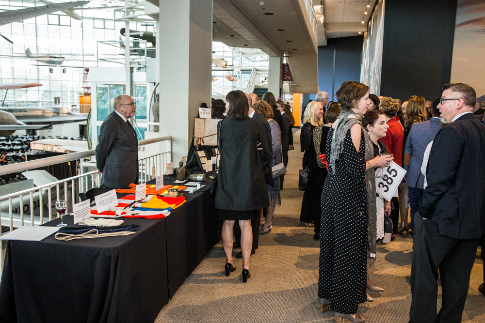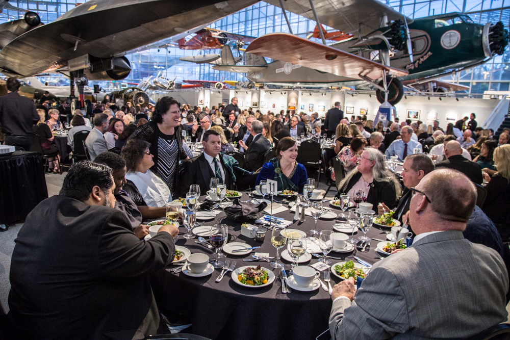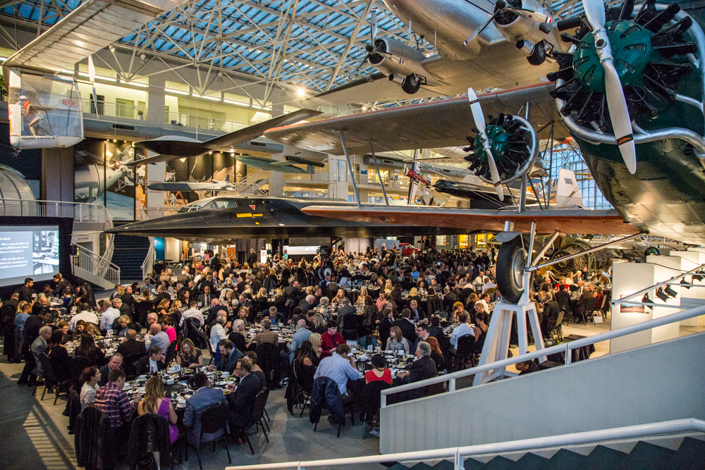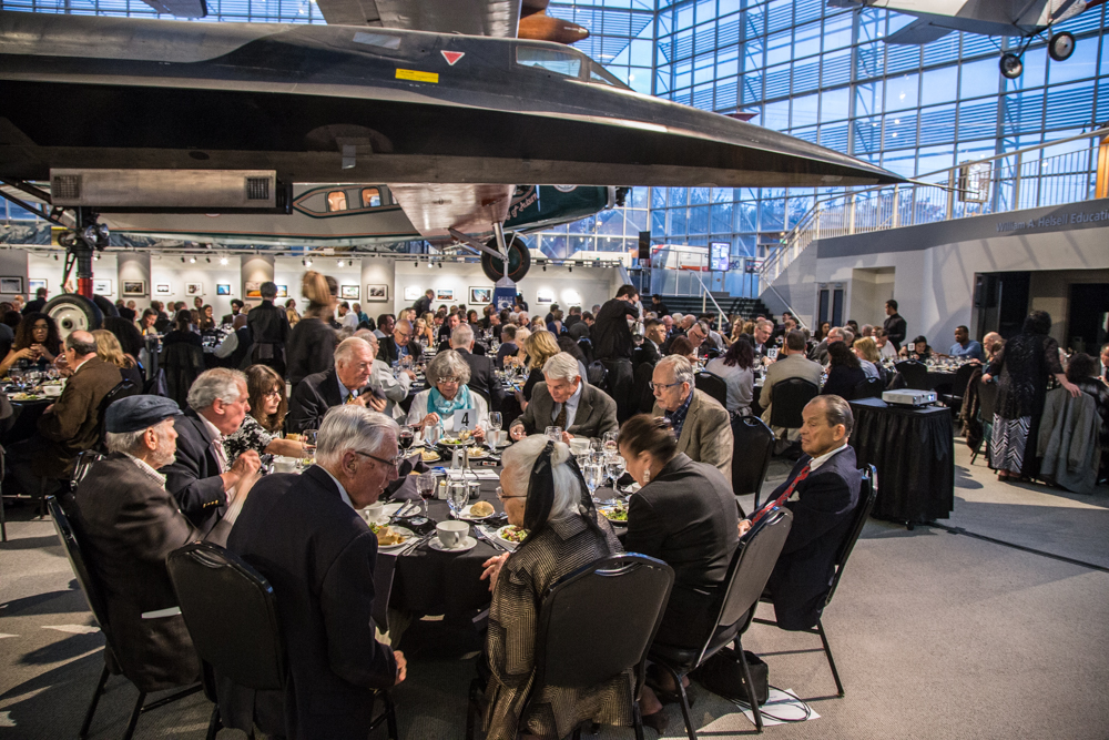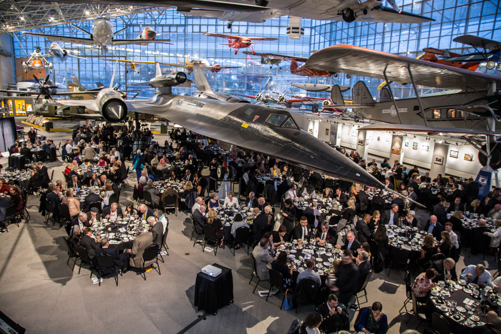- Guests seated in the Great Gallery underneath vintage aircraft