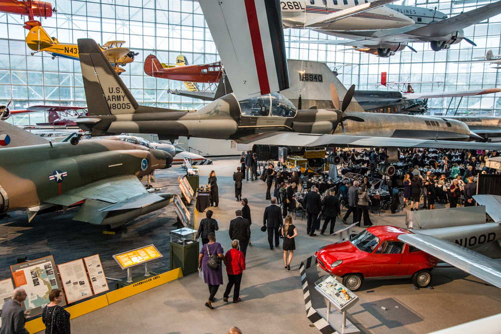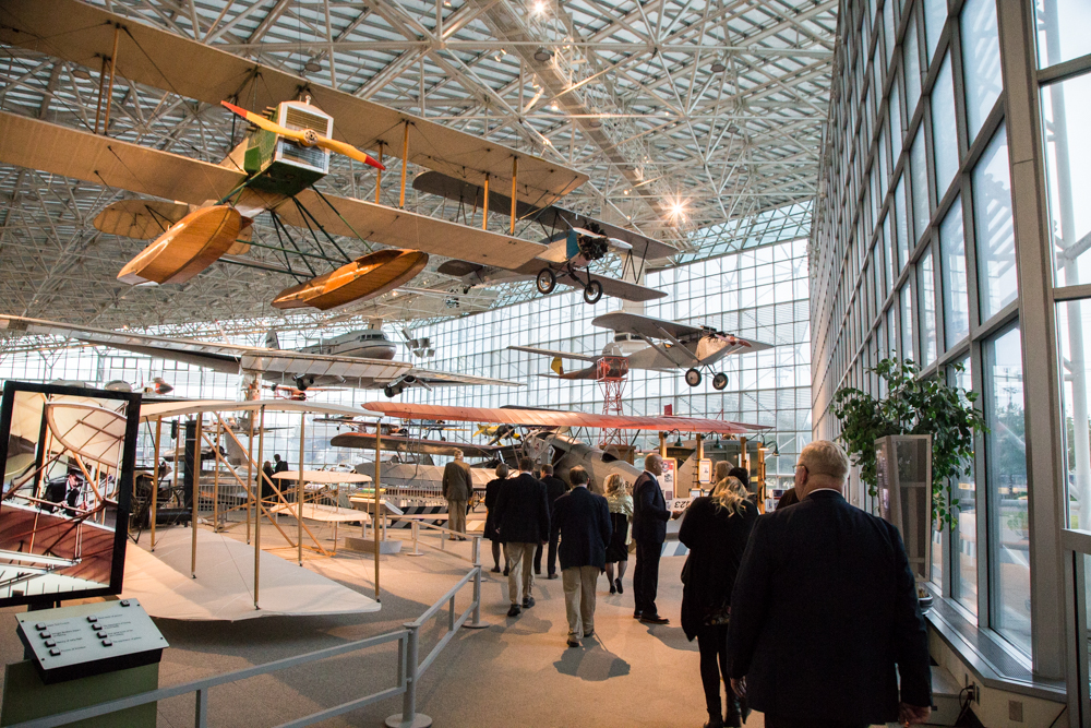 - Guests walking through the Museum of Flight underneath vintage airplanes hanging above
