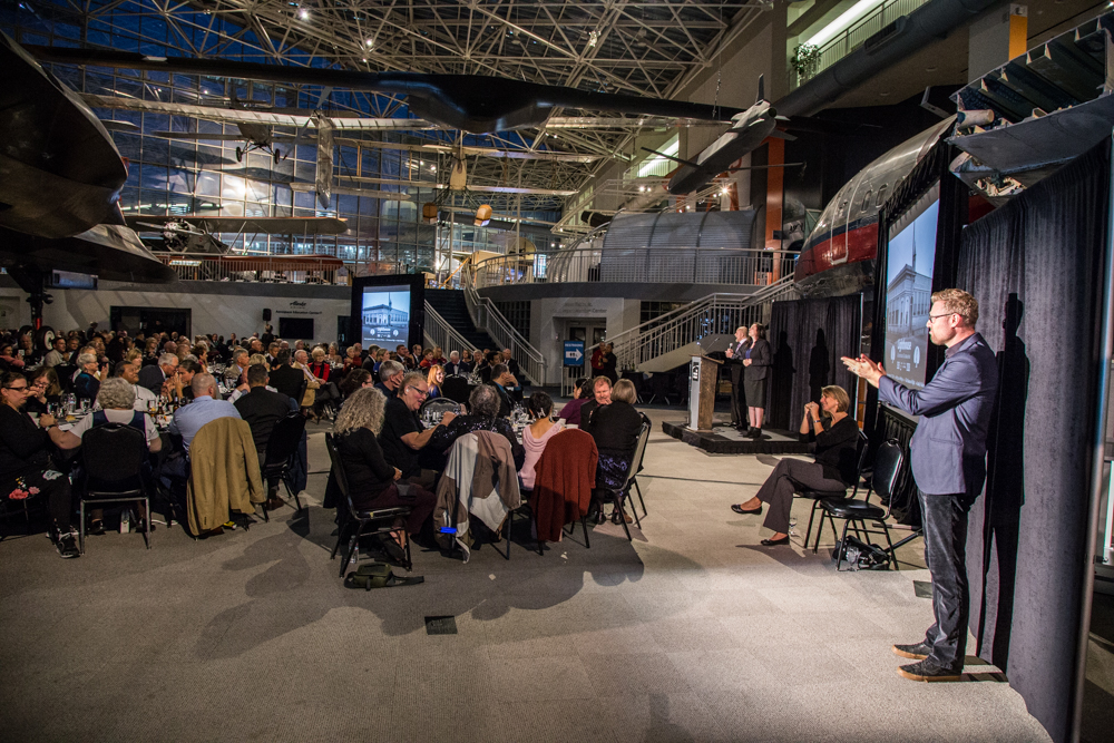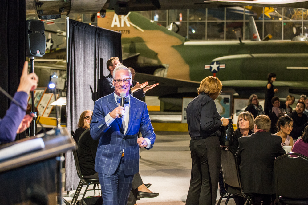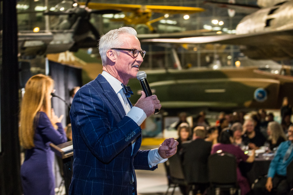 - Guest speaker Richard Turner addresses the guests gathered in the Museum of Flight.