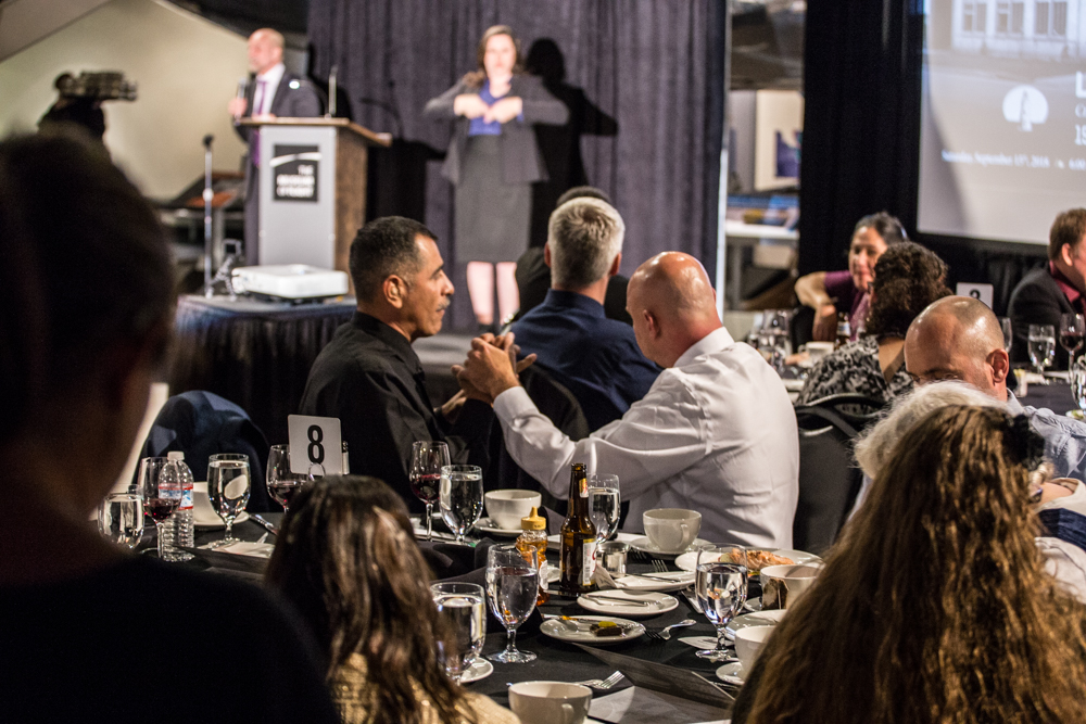 - Emcee John Curley at the podium standing next to an ASL interpreter